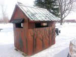 We mad a few blinds over the winter. We found a pallet yard that we got plywood, and some 2"x6"x 10' We cut all the 2"x6" in half and used 2"x3" for most of the frame. We have about $160.00 into each of these blinds. It was something fun to do over the winter. We didn't do windows because they didn't do us much good in the blinds we made last year. First thing we do when we hunt the blinds is open the windows anyway. And these blinds will be out in the crp so they should stay pretty clean. We had some material donations from friends, Like the paint and steel roofing.